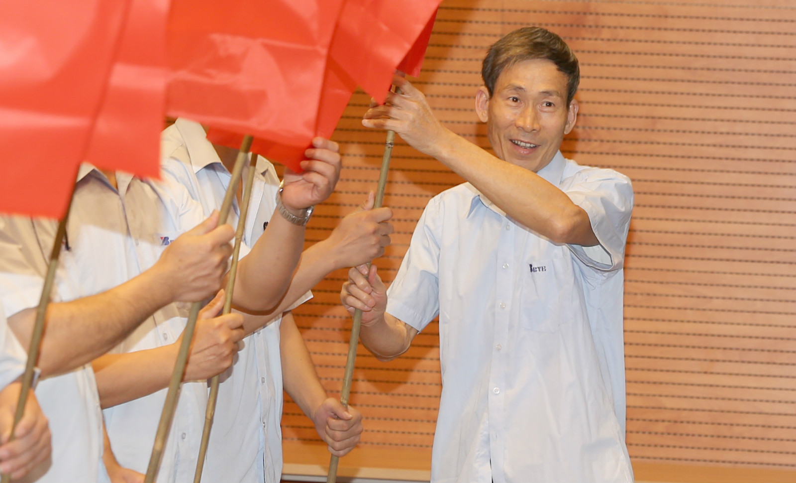 胡明聰總裁將十二面鮮紅的隊(duì)旗熱情而有力地授予十二支隊(duì)伍的代表,這不僅僅是一面代表榮譽(yù)和責(zé)任的旗幟,更是一面滿含期望與囑托的旗幟,是一代又一代白云人的傳承與發(fā)展的旗幟!十二支隊(duì)伍接過沉甸甸的隊(duì)旗后立即開始了認(rèn)真而又熱烈的團(tuán)隊(duì)文化創(chuàng)作,似乎想用自己精心創(chuàng)作的隊(duì)名回應(yīng)總裁的鼓勵(lì)與期許,“榮耀隊(duì)”、“降龍隊(duì)”、“人人爭先隊(duì)”……綻放出一線管理者們意氣風(fēng)發(fā)、朝氣蓬勃的風(fēng)采。全場起立,莊嚴(yán)的國歌聲將整場的氛圍推向高潮,“前進(jìn)、前進(jìn)、前進(jìn)進(jìn)……”氣勢磅礴的樂曲再次點(diǎn)燃了每個(gè)人銳意進(jìn)取的奮斗精神!