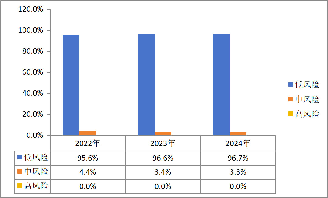 2024年,我公司高風(fēng)險(xiǎn)供應(yīng)商0,中風(fēng)險(xiǎn)供應(yīng)商占比為3.3%,低風(fēng)險(xiǎn)供應(yīng)商占比為96.7%,中/高風(fēng)險(xiǎn)供應(yīng)商審核率為100%。根據(jù)近三年供應(yīng)商風(fēng)險(xiǎn)評(píng)估數(shù)據(jù)顯示,我公司低風(fēng)險(xiǎn)等級(jí)供應(yīng)商數(shù)量占比呈現(xiàn)持續(xù)優(yōu)化態(tài)勢,供應(yīng)鏈風(fēng)險(xiǎn)管理水平顯著提升。